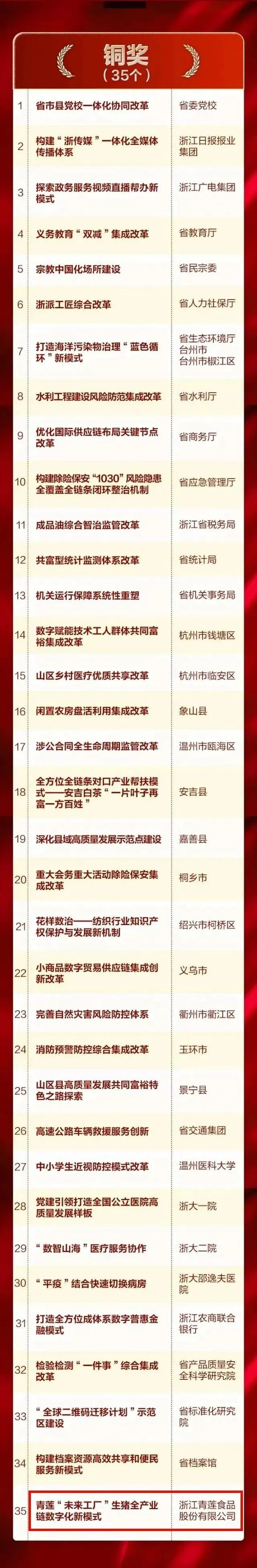 重磅!青蓮食品—膳博士榮獲浙江改革突破獎銅獎! 2023-02-01 09:20:19 浙江青蓮食品股份有限公司 瀏覽次數 2837 近日,浙江省委改革辦公布了2022年度浙江省改革突破獎名單。浙江青蓮食品股份有限公司“數智青蓮”未來工廠榮獲2022年度浙江省改革突破獎銅獎,是銅獎組中唯一的一家民營企業。20多年來,青蓮食品構建起從農場到餐桌的透明全產業鏈,在改革創新中以種業為源頭,建立起未來農場—未來工廠—產業新零售等數字化應用,真正從用戶需求出發為社會提供優質食品!此次獲得浙江改革突破獎銅獎,更是對青蓮食品數字化轉型成果的肯定和勉勵!實現黑豬專家膳博士在安全和美味雙升級上硬核突破!身為黑豬專家,膳博士服務過世博會、世乒賽、國際馬拉松比賽,連續8年為世界互聯網大會供肉,連續14年為中國極地研究中心供肉,成為杭州亞運會官方生鮮肉類產品供應商。以國家級嘉興黑豬和兩頭烏保種場作為種業基礎繁育國家級優質新品種,形成完整的黑豬商品體系為消費者帶來舌尖體驗。近年來,通過智慧養殖為傳統畜牧產業數字化轉型先行探路,以新一代信息技術為手段,重塑生豬全產業鏈生產組織方式和管理服務模式,構建“1+4+N”模型,推動全產業鏈數字化轉型。產業零售端以用戶需求為中心持續推出膳博士黑豬鮮肉鮮制系列產品提升消費體驗,滿足國人對美好生活、品質食品的向往。2022年,青蓮智慧牧場首批入選浙江省“未來農場”,“數智青蓮”未來工廠獲全省數字化改革“最佳應用”和全省數字經濟系統“最佳應用”。在全省數字化改革大會上做匯報演示,列入全省數字經濟系統地方特色應用目錄,受到央視、省級、市縣級等媒體持續關注報道。 上一條“風云浙商”許明曙:人生把一件事做好就很不容易 下一條全國唯一!膳博士·香雪白豬獲2022年度國家新品種認定!