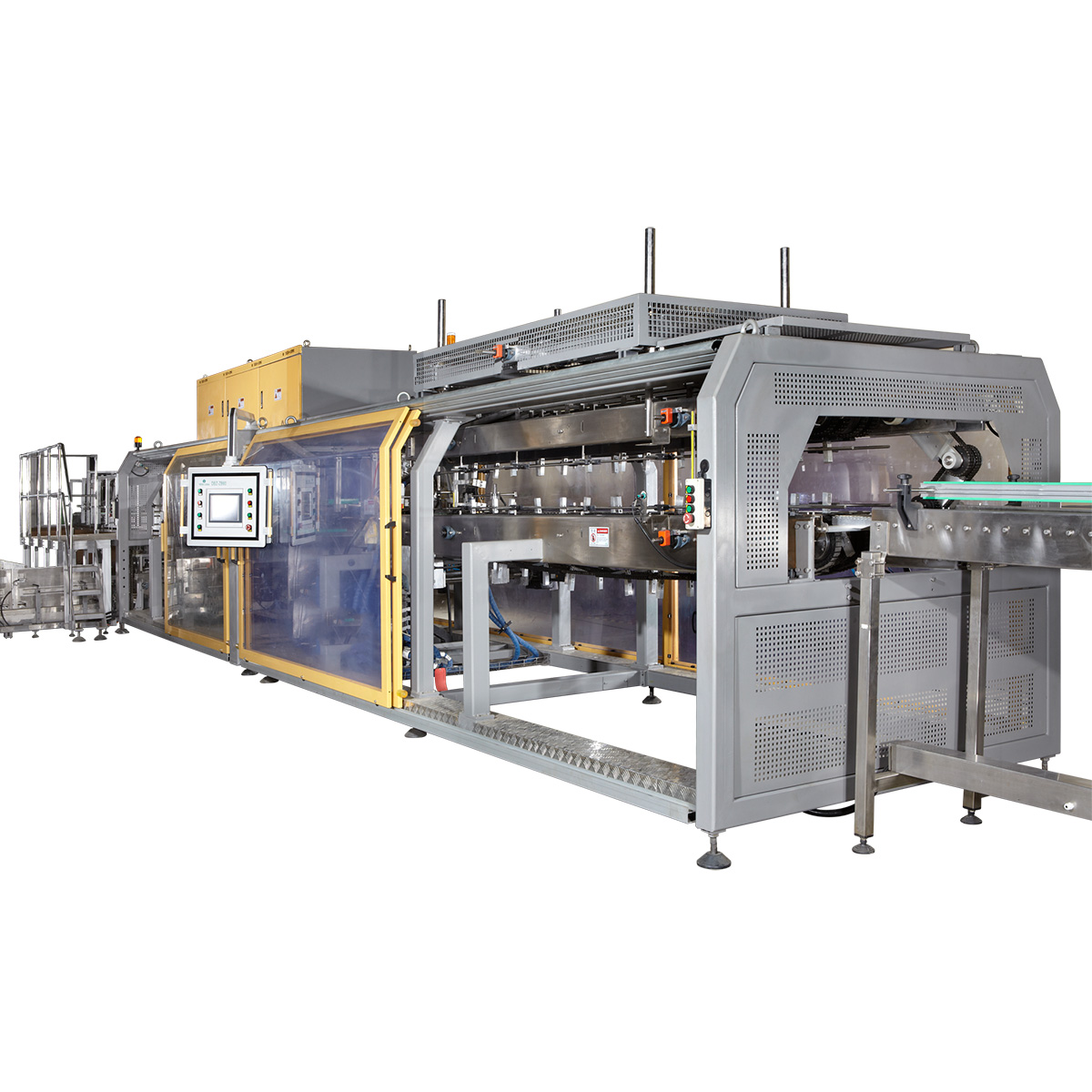 隆寶后包設備主要分為紙膜包、碼卸垛、裝卸箱三大系列。每個系涵蓋多種產品,廣泛的應用于飲料、食品、化工、醫療等行業。對各類瓶罐及桶裝水可進行二次包裝,并可與自動灌裝生產線配套使用。包裝產品具有自動化程度高、控制可靠、調整簡單、操作維修方便等優點。